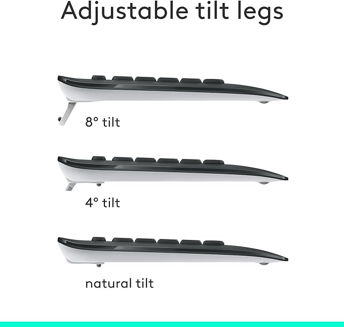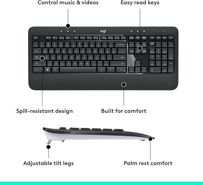 - Precision Typing: An instantly familiar experience, type with ease and comfort on this full-size wireless keyboard, featuring reduced noise, palm rest, spill-resistant design (1), adjustable tilt legs