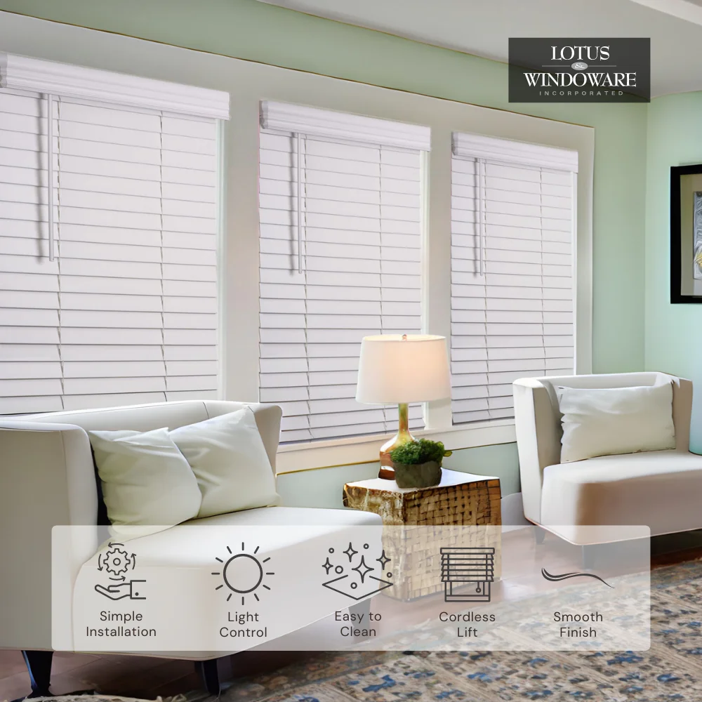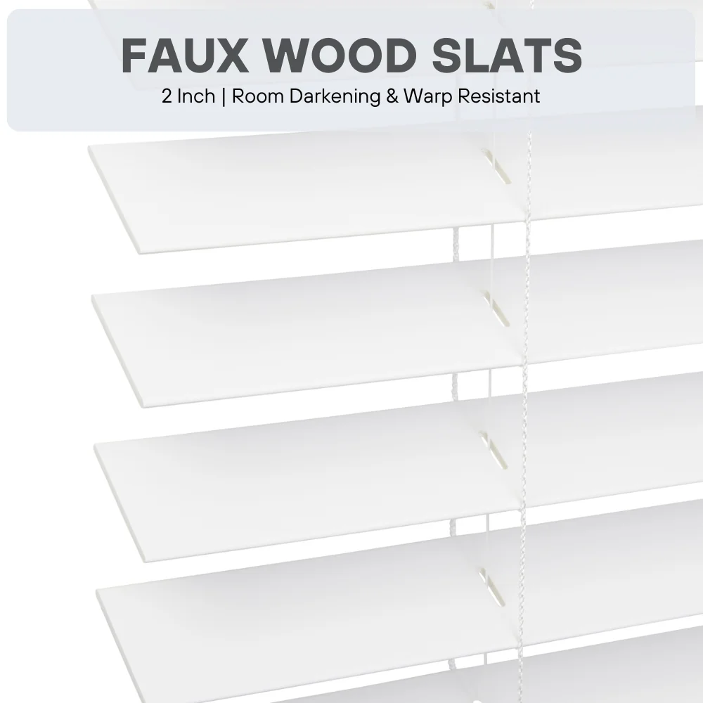 - Stylish Design & Durability: These Bright White Faux Wood Blinds for indoor windows feature a sophisticated textured wood pattern, enhancing contemporary home decor with style and warmth. Crafted from durable 2-inch PVC faux wood slats, they offer a smooth, moisture-resistant finish that prevents warping, peeling, or staining, making them ideal for living rooms, bedrooms, dens, and kitchens.