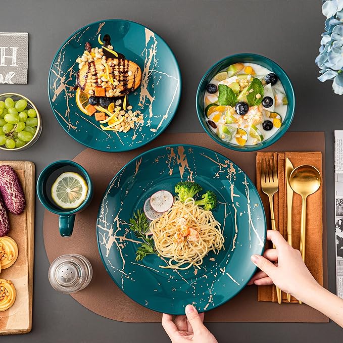 - 【LUXURIOUS ELEGANCE】 Unique gold splash design, elegant and attractive. Blackish green dish sets with plate, bowls and mugs is suitable for a variety of salads, soups, desserts, cereal and pasta.