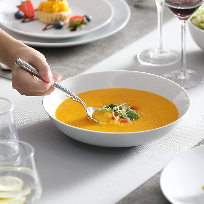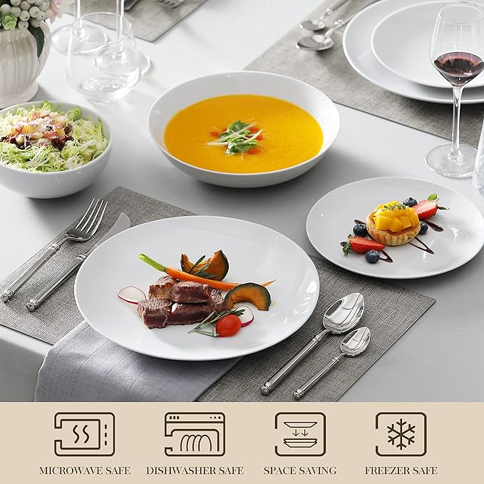 - 【WHAT\’S IN THE BOX】MALACASA 24-Piece White Dinnerware Sets for 6 – Includes 10.5\’\’ Dinner Plates, 8\’\’ Dessert Plates, 40 oz Soup Plates, and 26 oz Bowls.