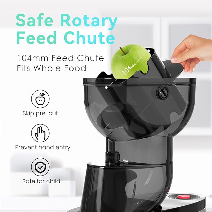 - 【Safe Rotary Feed Chute】The 4.1inch(104MM) larger feed chute allows you to skip the pre-cutting process, reducing your preparation time. The safe rotary feed chute prevents hands from entering, making it safer, especially for children.