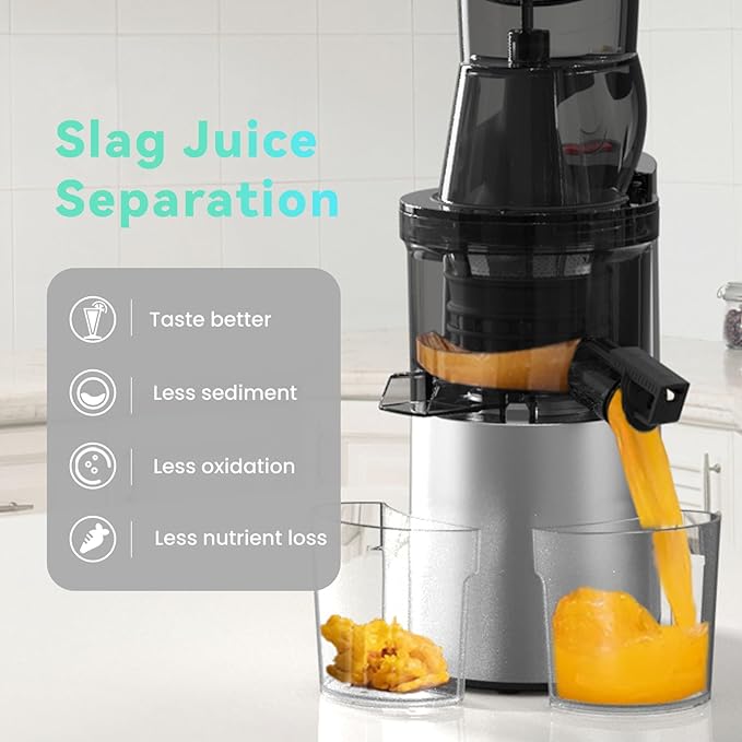 - 【Slag Juice Separation】Due to the slow pressing, the juicer machine doesn\’t damage the cell walls, which helps reduce oxidation and sediment, resulting in juice that has a better taste and higher purity.