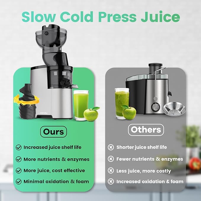 - 【Slow Cold Press Juice】The juicer cold-pressed at low speed to extend the shelf life of the juice, while preserving the nutrients and enzymes in the juice.