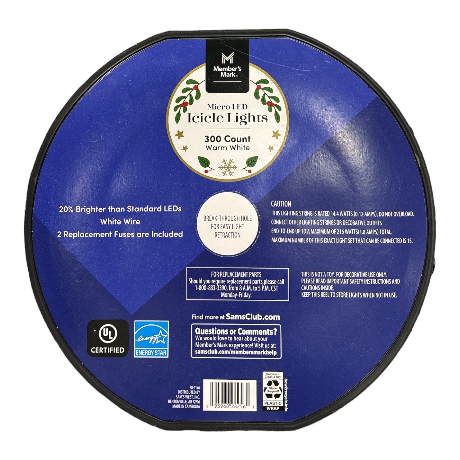 Member’s Mark 18′ 300-Count Super Bright Micro LED Icicle Lights are the perfect accent for your home during the holiday season. The super bright micro LED lights are 20% brighter than standard LED bulbs to ensure that your house has a bright and festive glow. Classic and beautiful, icicle lights are a popular choice for the holidays as they can be hung across angles or straight lines. Roof awnings, overhangs, peaks, and windows are great locations for hanging icicle lights because the drops lay naturally to create a professional and quality display with ease. These lights have a lighted length of 18 feet and can be connected to up to 15 strands. The lights can be used both indoors and outdoors. The LED lights have a long bulb life-25,000 hour on average and feature energy savings of 80%. With the long bulb life there are fewer resources used over time. These lights will stay lit even if one bulb burns out. An additional benefit of these lights is that they are environmentally friendly as both the light set and packaging are reusable. The lights are packaged on a reusable spool that is perfect for storage when the lights are not in use.