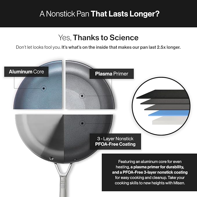 - Say Goodbye to Stuck Food: Misen’s Nonstick Frying Pan Set is your kitchen sidekick. This 10” pan beat the expensive ones – no more food sticking!