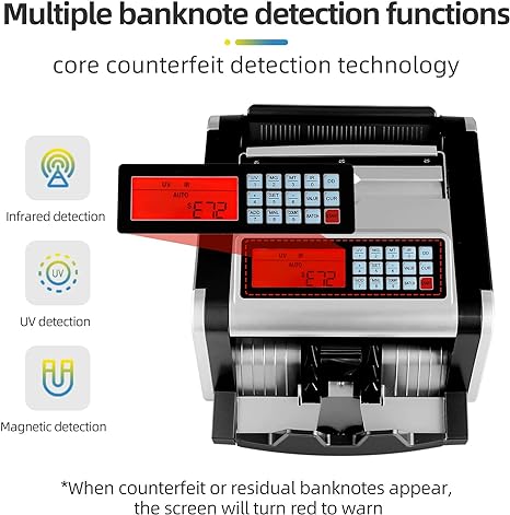 - 【Counterfeit Money Detection Technology】MG (magnetic detection), UV (ultraviolet detection), IR (infrared detection) and MT (metal wire) are all core counterfeit money detection technology applied in this money machine. Relying on image identification technology and multi-optical analysis technology, accurately identification of counterfeit and residual banknotes can be easily done through detection of ink on paper, magnetic map, size, paper quality, thickness….ect.