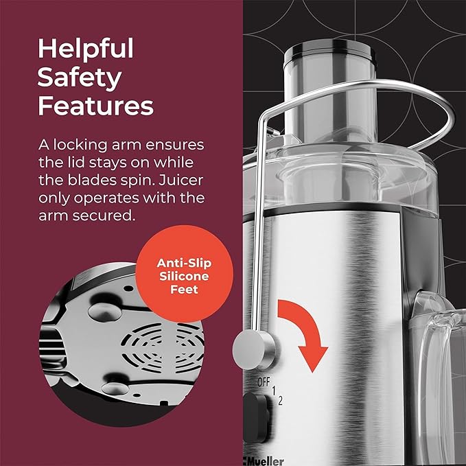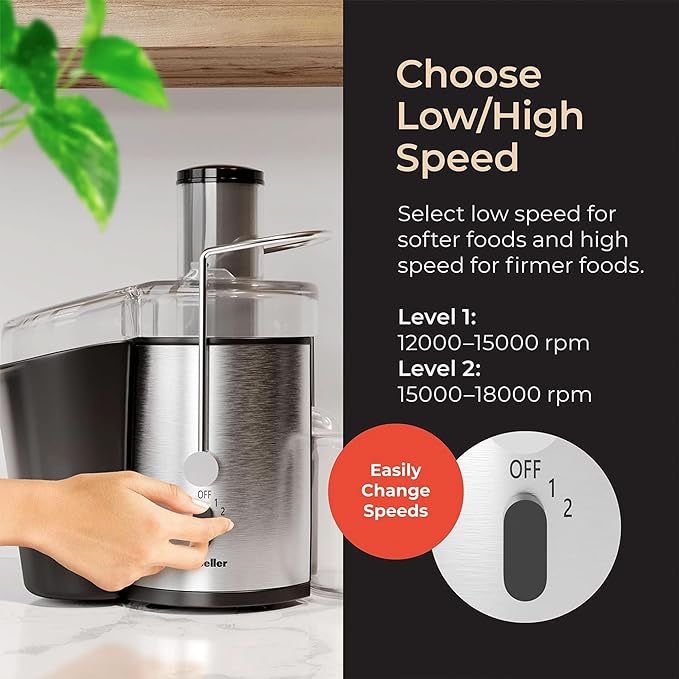 - “DUAL SPEEDS – Live a healthier lifestyle by consuming more fruits and vegetables with the compact yet powerful Mueller Ultra Juicer. Select high speed for harder foods (12000-15000 rpm) or low for softer foods (15000-18000 rpm).”