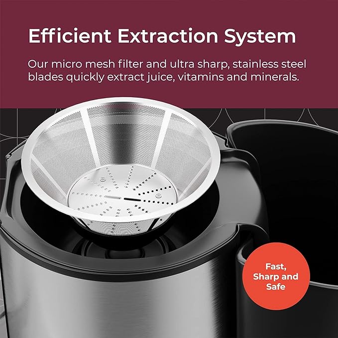 - “EASY TO CLEAN – Use the included brush to clear debris from the stainless steel blades. Juice extraction provides an easy way for you and your family to consume more healthy foods. Enjoy a glass of orange juice! Use tomato pulp to make salsa!”