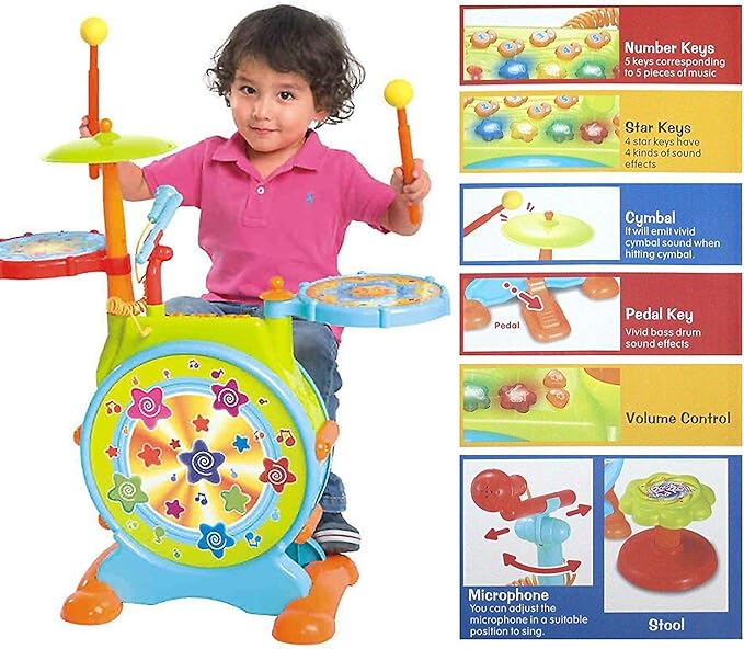 - 5 MODES OF PLAYING FUN – drum beats, free play, funny sounds, songs and melodies, and dance music. Drum lights up (LED lights) with every beat making your child feel like a rockstar on a stage.