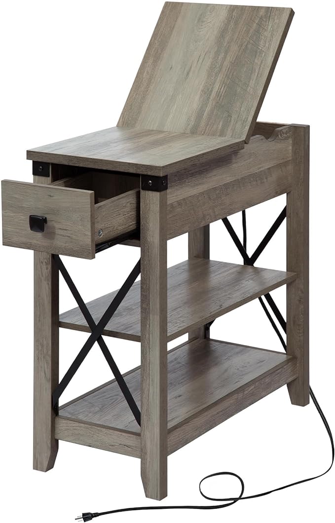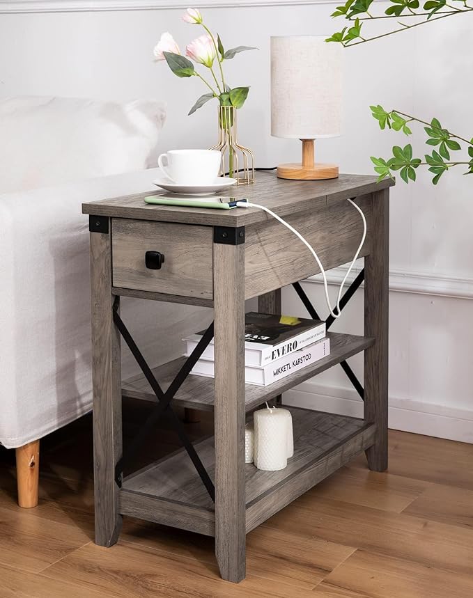 - 【Multiple Use Storage Narrow Side Table】Our End table with a drawer and 2 wooden shelves that offer you ample space to store. The hidden compartment beneath the tabletop will help you organize your remotes, meds, game controllers & phone charger cords. The 2-Tier wooden shelves which you can place phone lamps books and etc. Great for living room bedroom home office and small spaces. The fully expandable Flip Top plate of the drawer makes it more convenient.