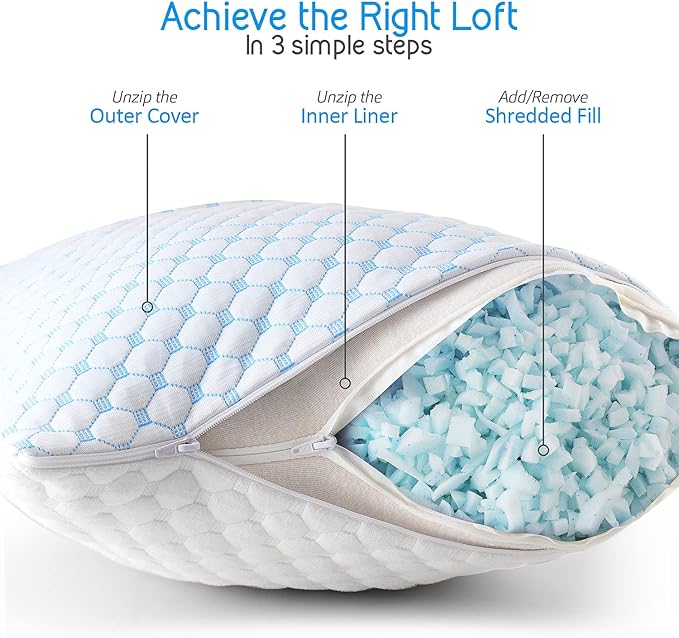 - 20”x28” Adjustable Queen Pillows 2 Pack: Choose your preferred level of firmness with adjustable loft. Add or remove foam pieces to create a customized cooling pillows for sleeping on your side, back, or stomach.