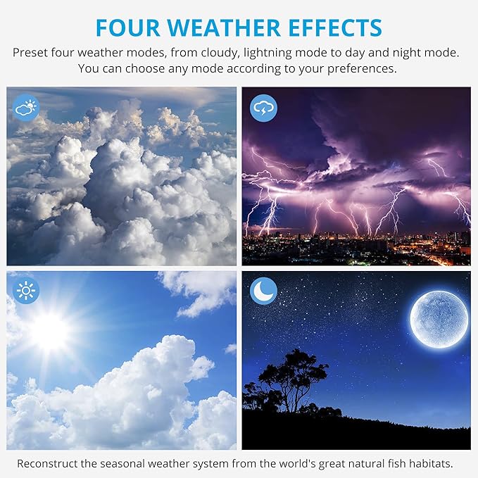 - Multiple Functions: Built-in preset 24/7 mode to take care of your freshwater fish and plants, just set the current time to enter the loop. 5 built-in preset lighting modes create a dreamy aquarium environment. Comes with 4 weather modes to better simulate the natural ecosystem