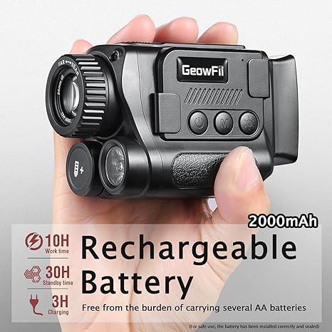 - 🏹2000mAh Rechargeable Battery——GeowFiiTech will always give you a practical and convenient rechargeable battery (2000mAh & up to 10H working time), which will set you free from the burden of carrying several AA batteries, as this night vision goggle can be charged at any time and any situation with a power bank or car charger. We love the environment and are willing to do more efforts for it.