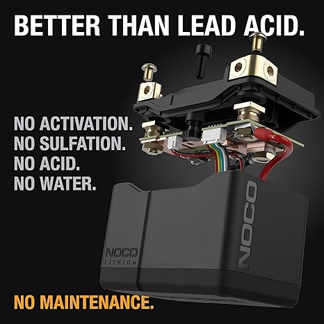 • Introducing NOCO Lithium – It’s better than lead-acid in almost every way. No sulfation. Requires no activation, no acid, no maintenance, and no water needed. And it comes fully charged and ready to install.