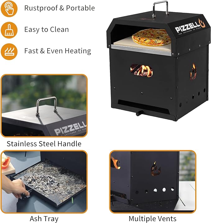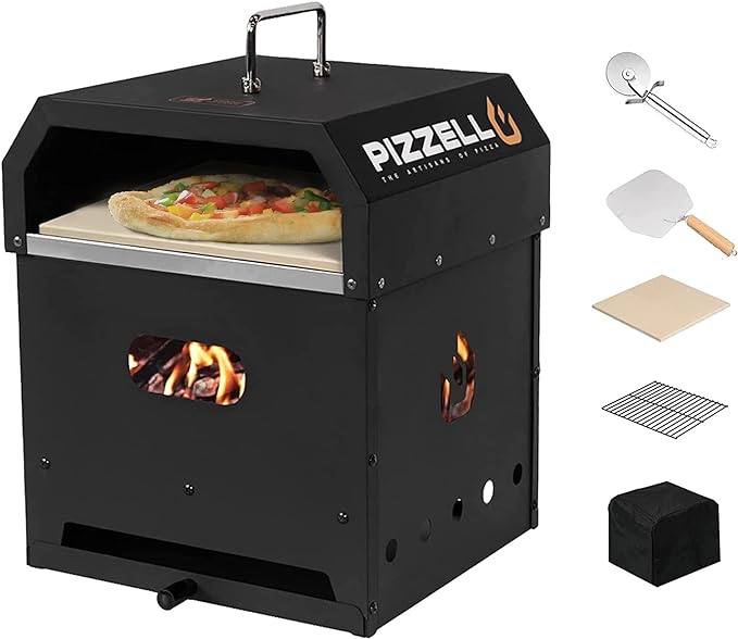 - 【What You Get】 Pizzello wood fired pizza oven kit comes with 1 x 16″ Wood Pizza Oven, 1 x Outdoor Fire Pit, 1 x Stainless Steel Pizza Peel, 1 x16″ Pizza Stone, 1 x Waterproof Cover to prevent dust, 1x Ash Tray for collect and easy removal of ash. Easy to assemble and quick to start making mouth-watering dishes for your loved ones.