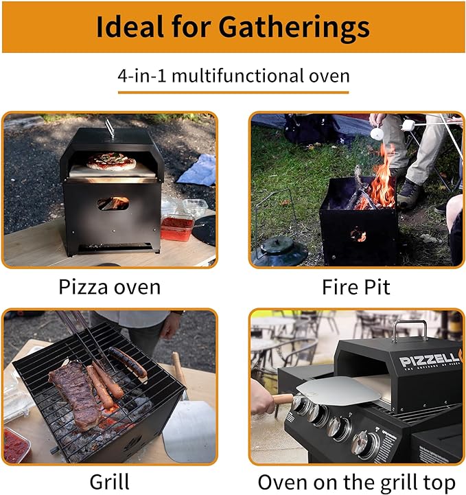 - 【4 in 1 Pizza Oven】 The 2-tier detachable design means you can use 2 functions simultaneously. When you put the pizzello gusto oven top on the grill to make pizza, you could still use the fire box to barbeque. Are any More Functions? Take it as a giant 16 inches stand-alone fire pit, a charcoal bbq grill, or a baking pizza oven—Real 4 functions in one.