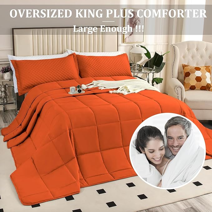 - 【Oversized King Plus Comforter 128″x120″ !!!】 What’s include: a burnt orange quilt (128″x120″) and 2 pillow shams (20″x36″). Bedspread reaches the floor on both sides and bottom. It is actually large enough to keep yourself and your husband/wife from pulling and hunting for covers during the night