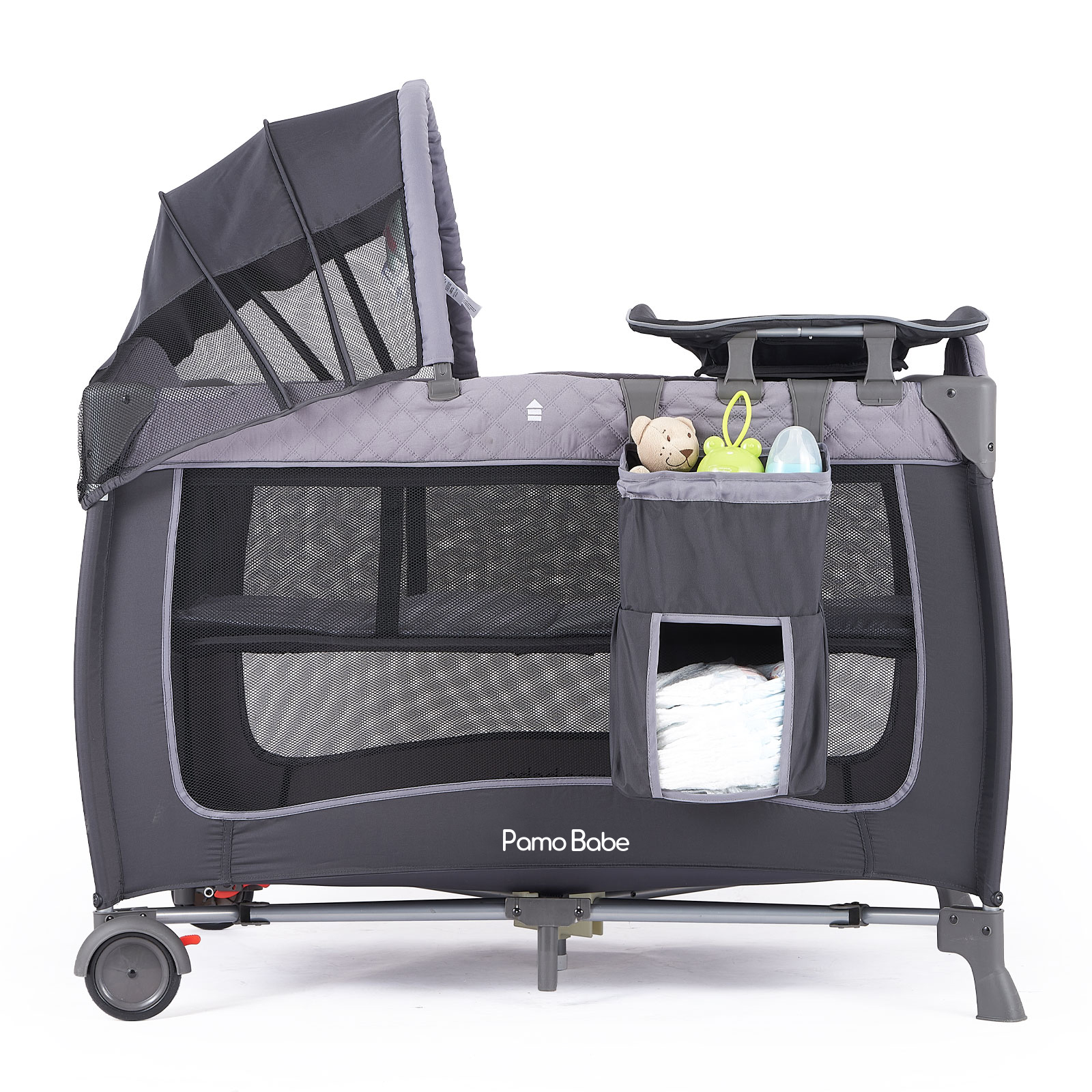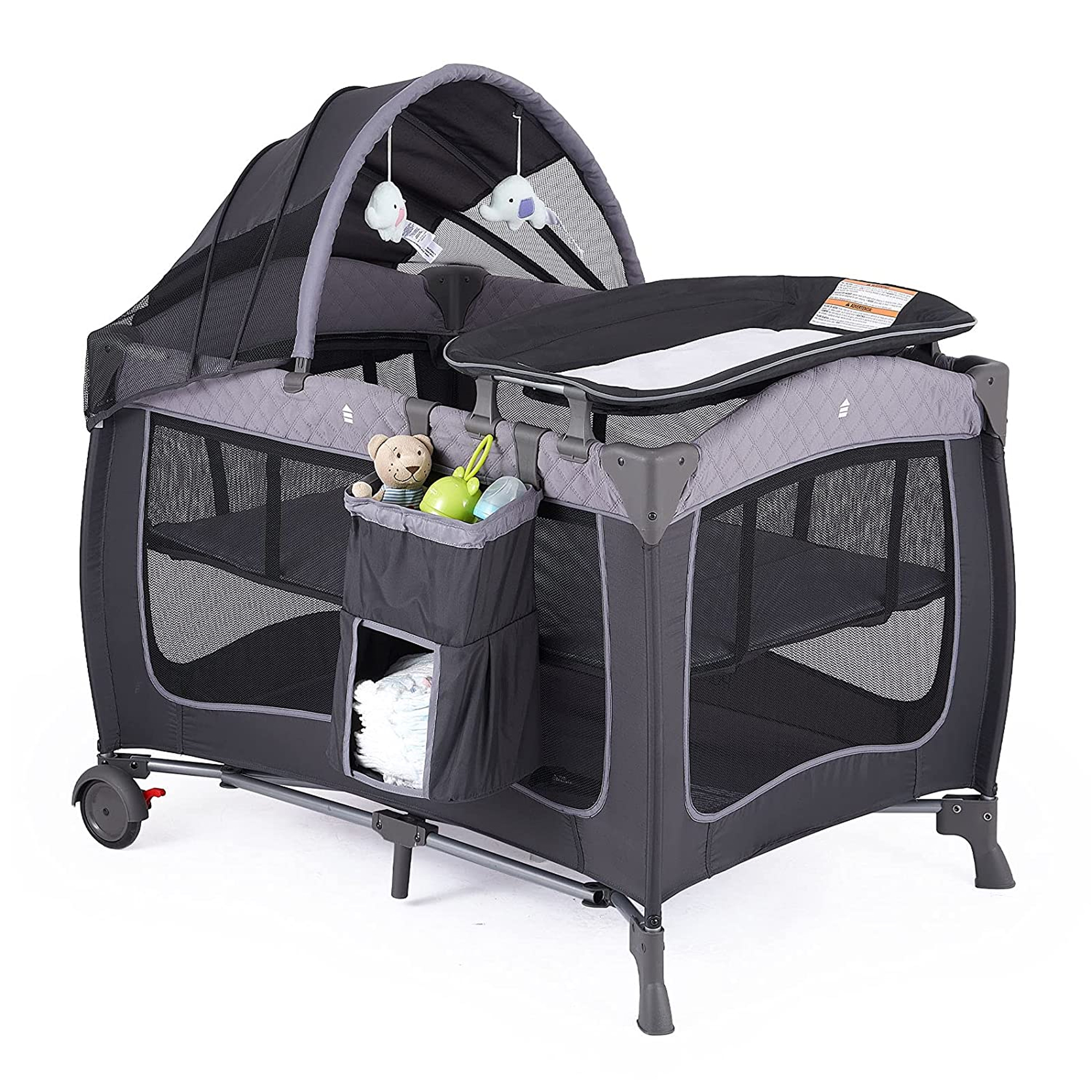 - 【DETACHABLE & FOLDABLE DESIGN】–The changing table, storage bag, bassinet and canopy can be easily removed from the baby playard. And the playard can be quickly folded up without extra tools. The handbag helps you store the folded crib and take the crib out for travel.