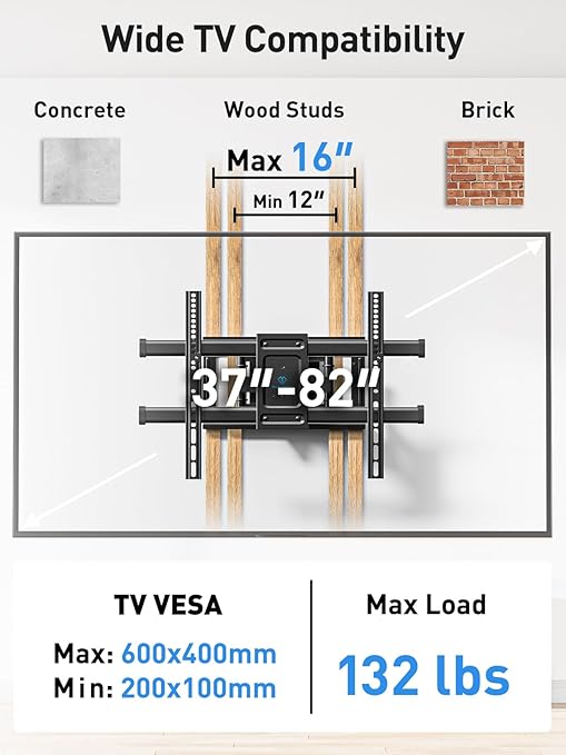 - Strong and Sturdy: The dual articulating arms of this swivel and tilt tv wall mount are made with high-strength steel to support up to 132 lbs of weight. Compatible with 12”-16” wood studs, concrete, and brick wall mounting.