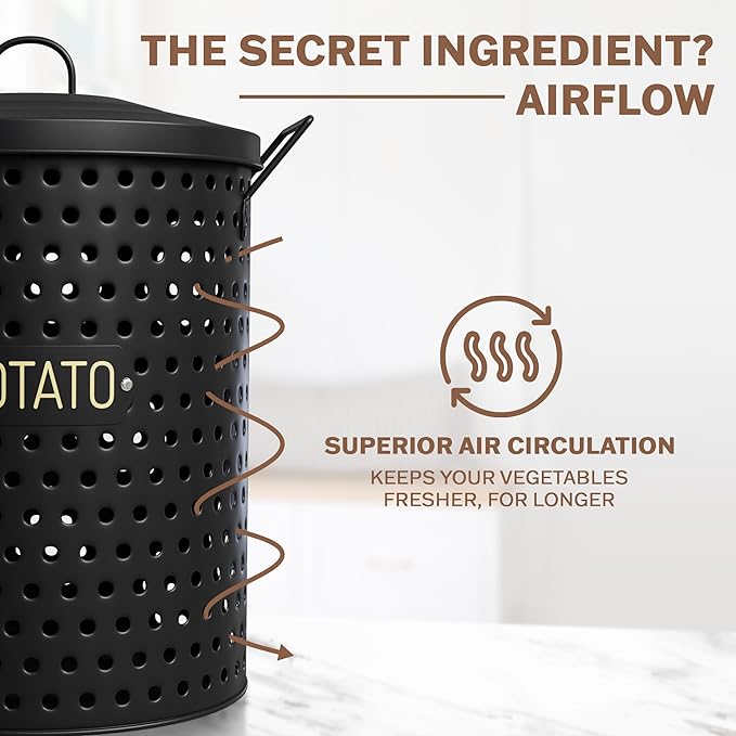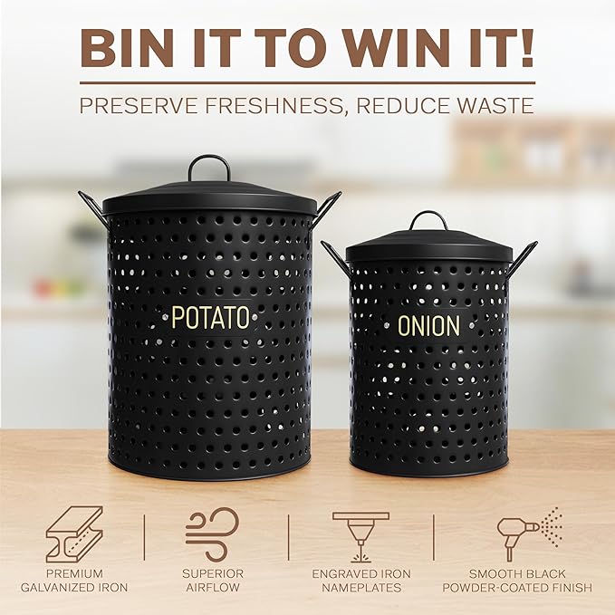 - ADD A TOUCH OF ELEGANCE to your kitchen with the matte black finish of our potatoes and onions storage bin. Its neutral color blends with any kitchen decor, making it a perfect addition to your countertop