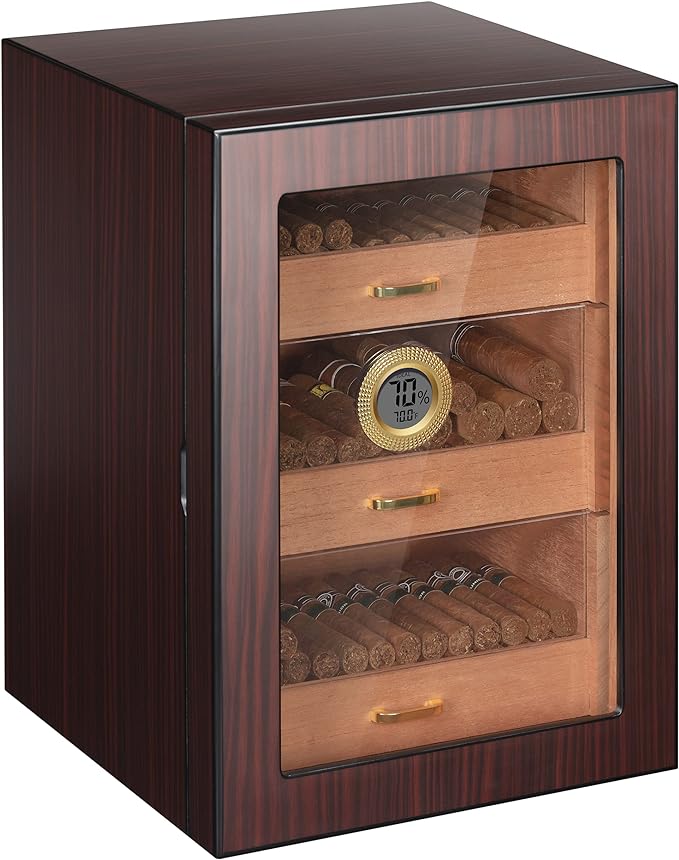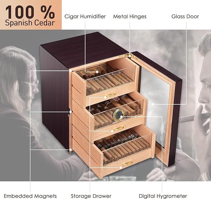 - EXCELLENT SEALING AND MOISTURIZING – The handcrafted humidor cigar box is made of Spanish Cedar wood, which provides pleasant aromas and helps to reduce excess moisture. A tight magnetic seal ensures that the cigar box humidity stays between 65% and 70%, keeping the flavor and aroma of your cigars. The tempered glass door lets you show off your cigar collection and check humidity level at any time without opening it up