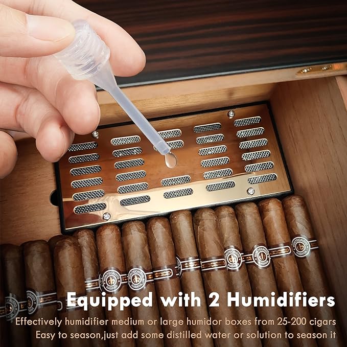 - ADVANCED HUMIDITY CONTROL SYSTEM – This cigar humidor equips with 2 with crystal gel humidifiers providing a steady release of moisture, which can be seasoned simply by adding distilled water or solutions. Ensuring your precious cigars are storaged in ideal humidity level (65%-72%) at all times