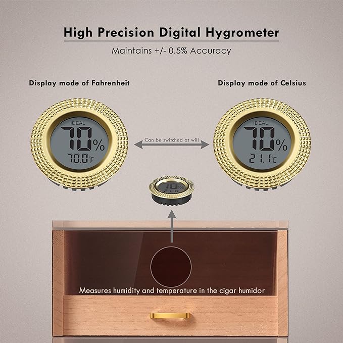 - HIGHT PRECISION DIGITAL HYGROMETER – This cigar humidor built-in a high-precision digital hygrometer, which can accurately monitor relative humidity and temperature inside a cigar humidor to let you know if you need to add or reduce some excess water