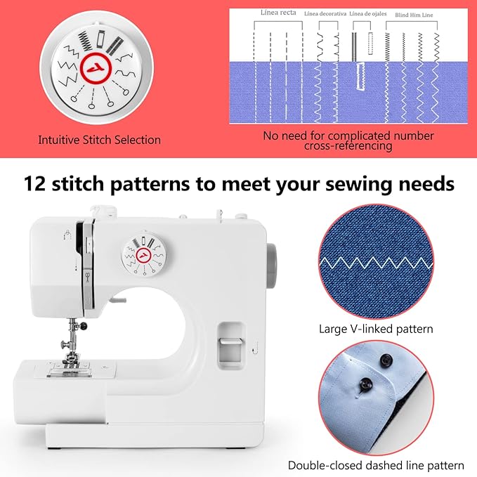 • ⭕【Multi-Use Sewing Machine】There are 12 stitch patterns, each corresponding to a different sewing method, which can be adjusted to different gears for use according to your needs, including front and back stitch, sleeve stitch, and two-line flat stitch, replaceable pedals, perfect for sewing leather, jeans, children\’s clothing, shopping bags, tablecloths, purses, dolls, pillows, skirts, holes, tears, etc