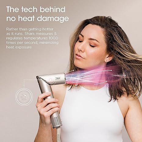- NO HEAT DAMAGE: Giving you fast drying while maintaining low heat, measuring & regulating temperatures 1,000x per second to ensure consistent air temperature. Rather than getting hotter as it runs, Shark minimizes heat exposure & regulates temperatures.