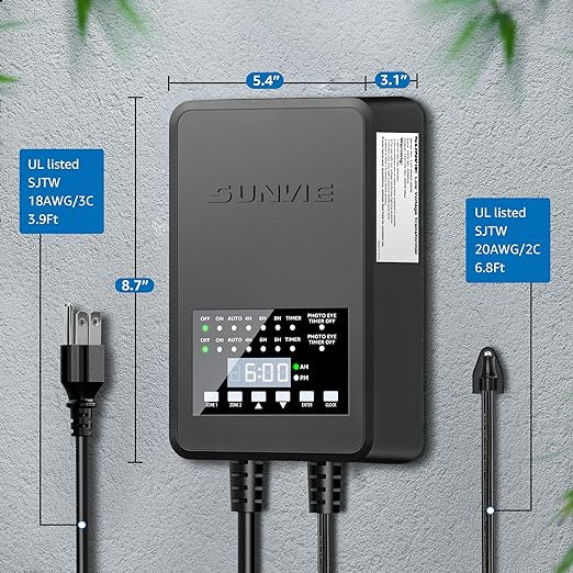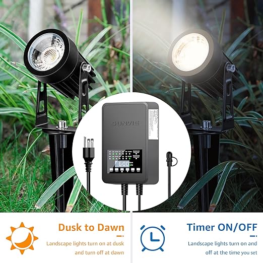 SUNVIE 200W Low Voltage Landscape Transformer with 2 Independent Control Output Landscape Lighting Transformer with Timer and Photocell Sensor 120V AC to 12/14V AC Weatherproof Low Voltage Transformer