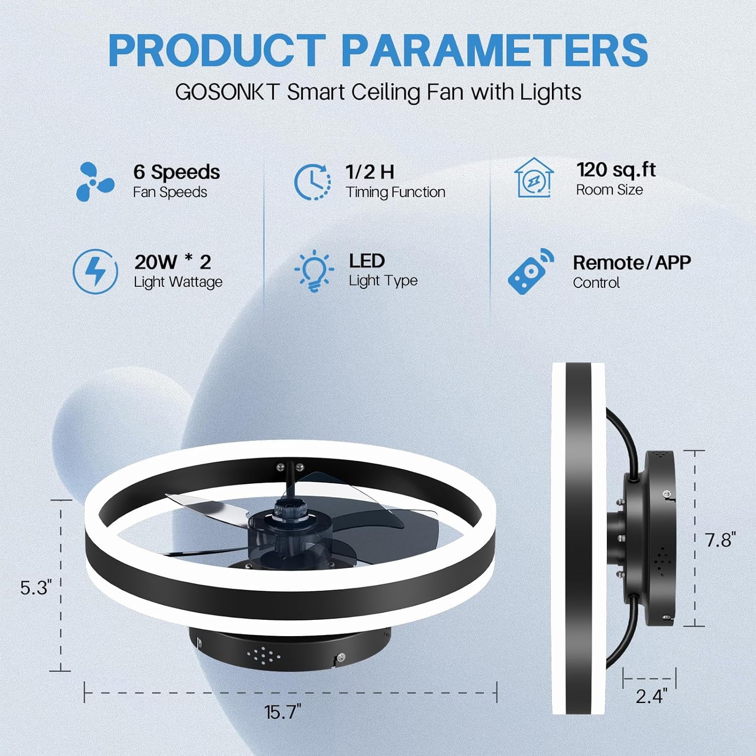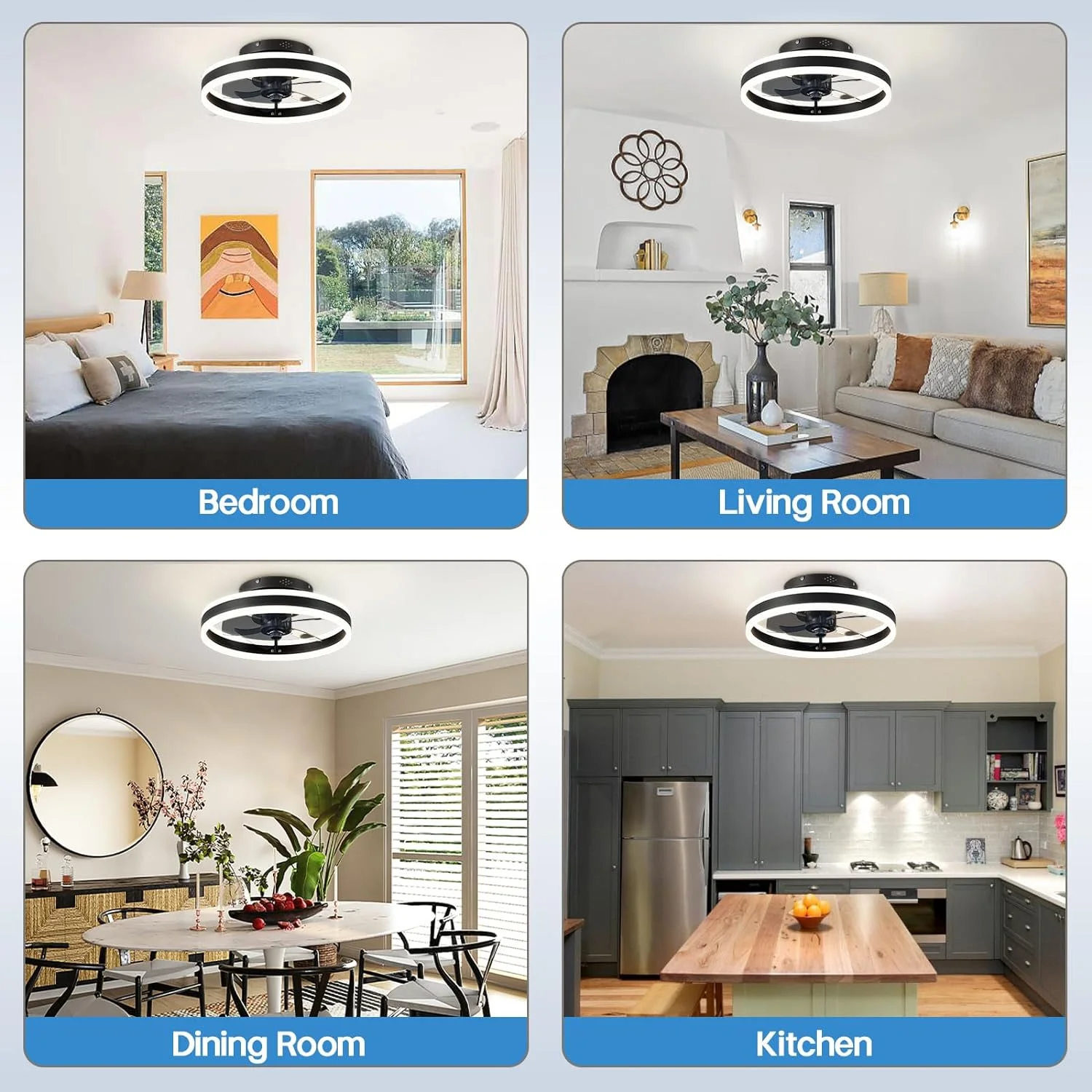 Surnie Low Profile 15.7″ LED Small Ceiling Fan with Light – Modern, Semi-Enclosed Flush Mount, Smart APP and Remote Control, 6-Speeds, Black – Perfect for Bedroom and Living Room