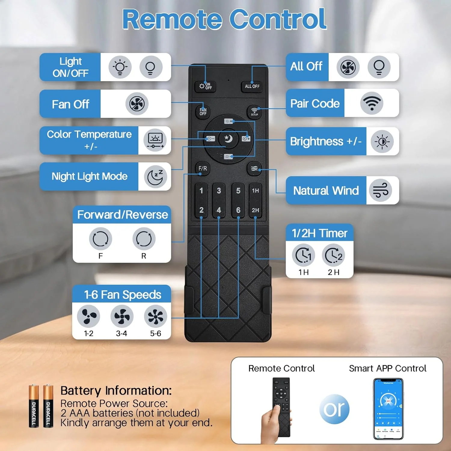- 𝙑𝙚𝙧𝙨𝙖𝙩𝙞𝙡𝙚 𝙍𝙚𝙢𝙤𝙩𝙚 & 𝘼𝙥𝙥 𝘾𝙤𝙣𝙩𝙧𝙤𝙡: This fan-light includes a high-sensitivity remote control for easy adjustments, and for ultimate convenience, it’s also compatible with a smart app. Seamlessly control the dimming, three-color temperature adjustments, and the 6-speed airflow options. Activate the timer function (1/2 hour) and night mode, all conveniently at your fingertips. The fan-light even remembers your preferred settings after turning off the lights.