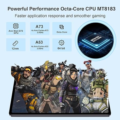 - 【16GB (8GB+8GB Virtual) RAM 256GB ROM and Powerful Processor】: The tablet builts in 16GB (8GB physical + 8GB virtual) RAM and 256GB ROM with up to 1TB of TF card expansion support. Which could stores tons of movies, music, eBooks, etc. The MediaTek MT8183 2.0Ghz octa-core CPU contains four powerful Arm Cortex-A73 “big core” and four Cortex-A53 cores and powerful Arm Mali-G72 level graphics processor. which could easily provide smooth gaming experience and high-speed APP operation.