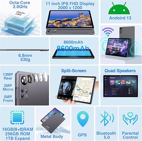- 【Android 13 OS and Dual Band WIFI Tablet】: This 11inch WIFI tablet is powered by the latest Android 13 OS with a more beautiful UI and more useful features. Desktop components can be adjusted according to preferences. And it pays more attention to privacy and security. Adopting 802.11ac standard, which covers both 5GHz and 2.4GHz bands at the same time, providing faster network and stability. Support split-screen function like watching TV and reading at the same time.