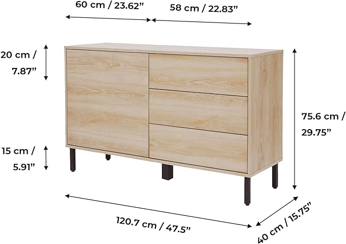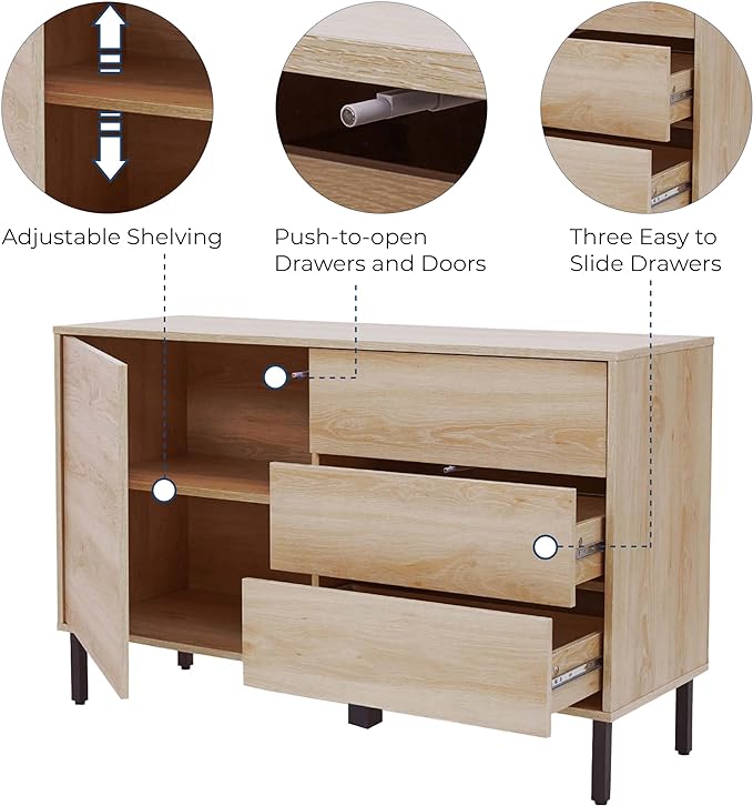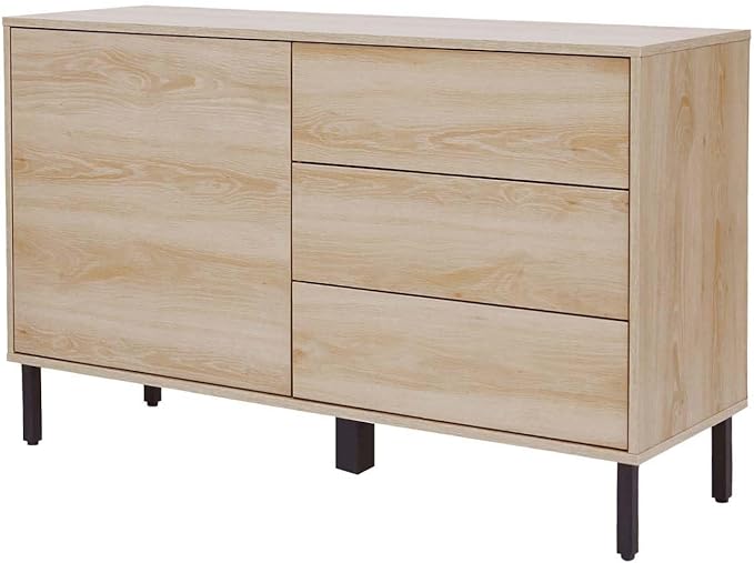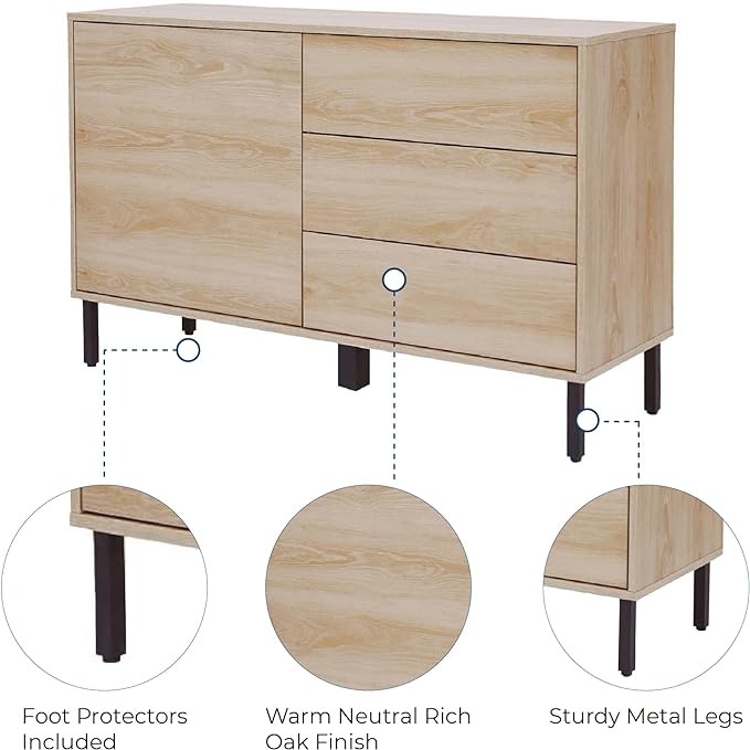 Teamson Home Cairo 47.5\" Mid-Century Modern Wooden 3-Drawer Sideboard with Cupboard and Metal Legs, Oak