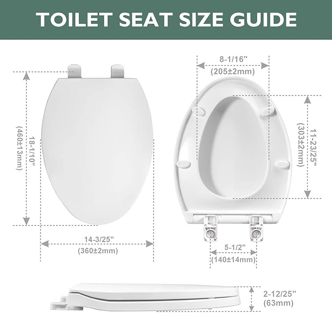 • SIZE: ELONGATED : The elongated toilet seat fits most standard elongated toilet seats. It measures 18.5 \” in length, 14.2 \” in width, and 5.6\” of Mounting hole distance.Please measure your toilet size before your purchase to determine if you need ELONGATED size.