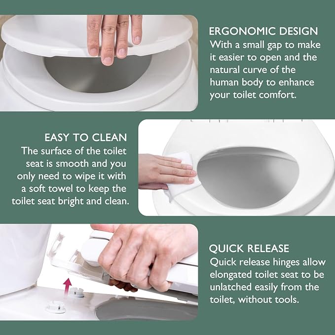 • EASY TO CLEAN: Opens the hinged cover,Quick Release hinges allow oval toilet seat to be unlatched easily from the toilet. You can clean the areas that hard to reach, which keeping your bathroom fresh and comfortable.
