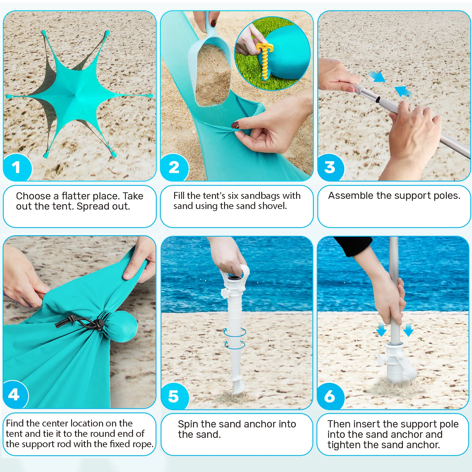 For family trips to the beach, weekend soccer games or summer camping trips, nothing makes a hot day more enjoyable than some cool beach sunshade. Comes with a portable storage bag with a handle, you can easily fit our sun shade tent in your luggage and carry it anywhere without any hassle. This portable pop up beach tent sun shelter can become your go-to companion when going to the beach, park, picnic party, fishing or music festival.