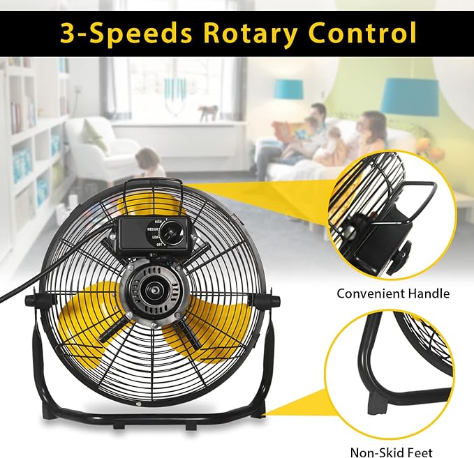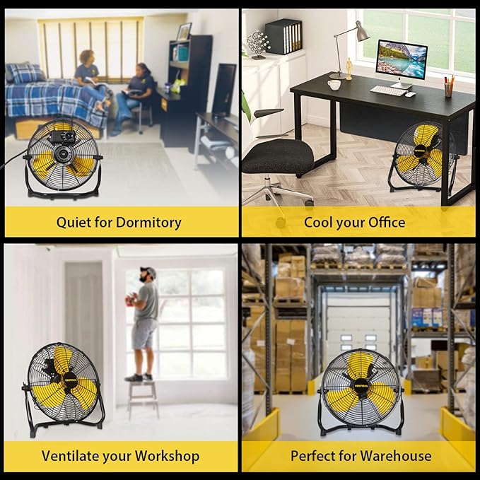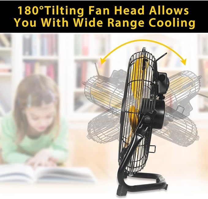 • 180°Adjustable Tilting Metal Floor Fan: Pivoting head to direct air flow and circulation, different angles allow you to enjoy high velocity air up, down, or anywhere in between making this electric fan ideal for cooling or ventilation of an area. Great to use in dorm,office,workshop,basement,bedroom,etc