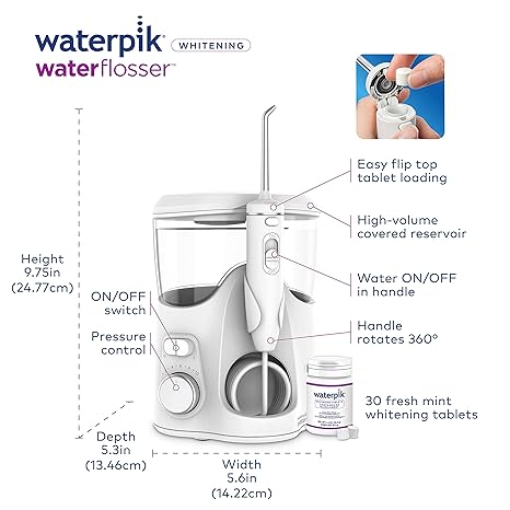 The Waterpik Whitening Water Flosser delivers precision teeth whitening – while you water floss. It restores your natural whiteness in just 4 weeks by removing hard-to-reach stains that other products miss. It’s clinically proven to remove up to 25% more stains than brushing alone. And it removes up to 99.9% of plaque from treated areas. To use, simply insert the whitening tablet into the water flosser flip-top handle. The whitening infuser technology expertly mixes water with a gentle stain removal agent that safely restores your natural whiteness, removes plaque, and promotes healthier gums. The Waterpik Whitening Water Flosser is ideal for those who don’t want to use harsh bleaching chemicals or undergo expensive teeth whitening treatments.