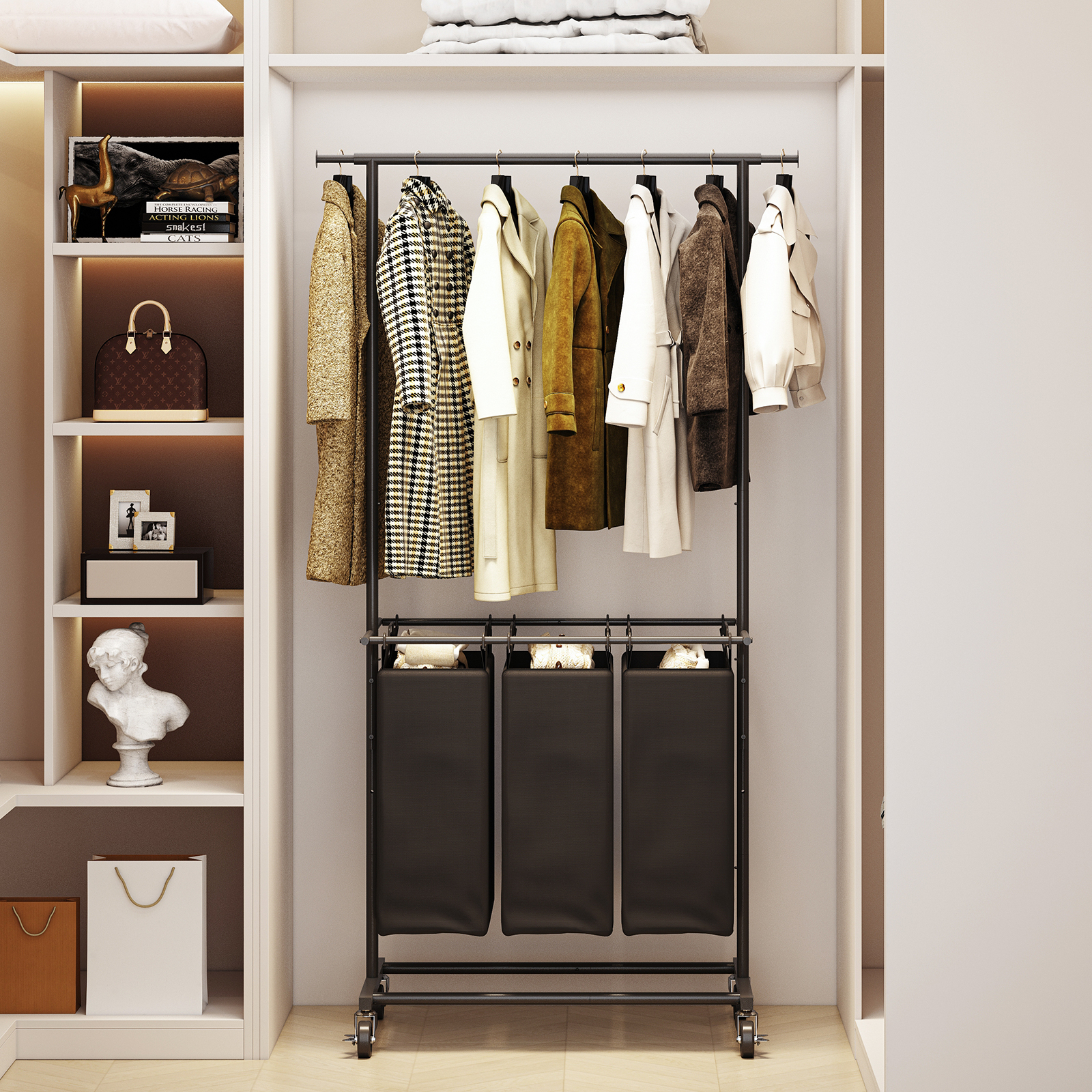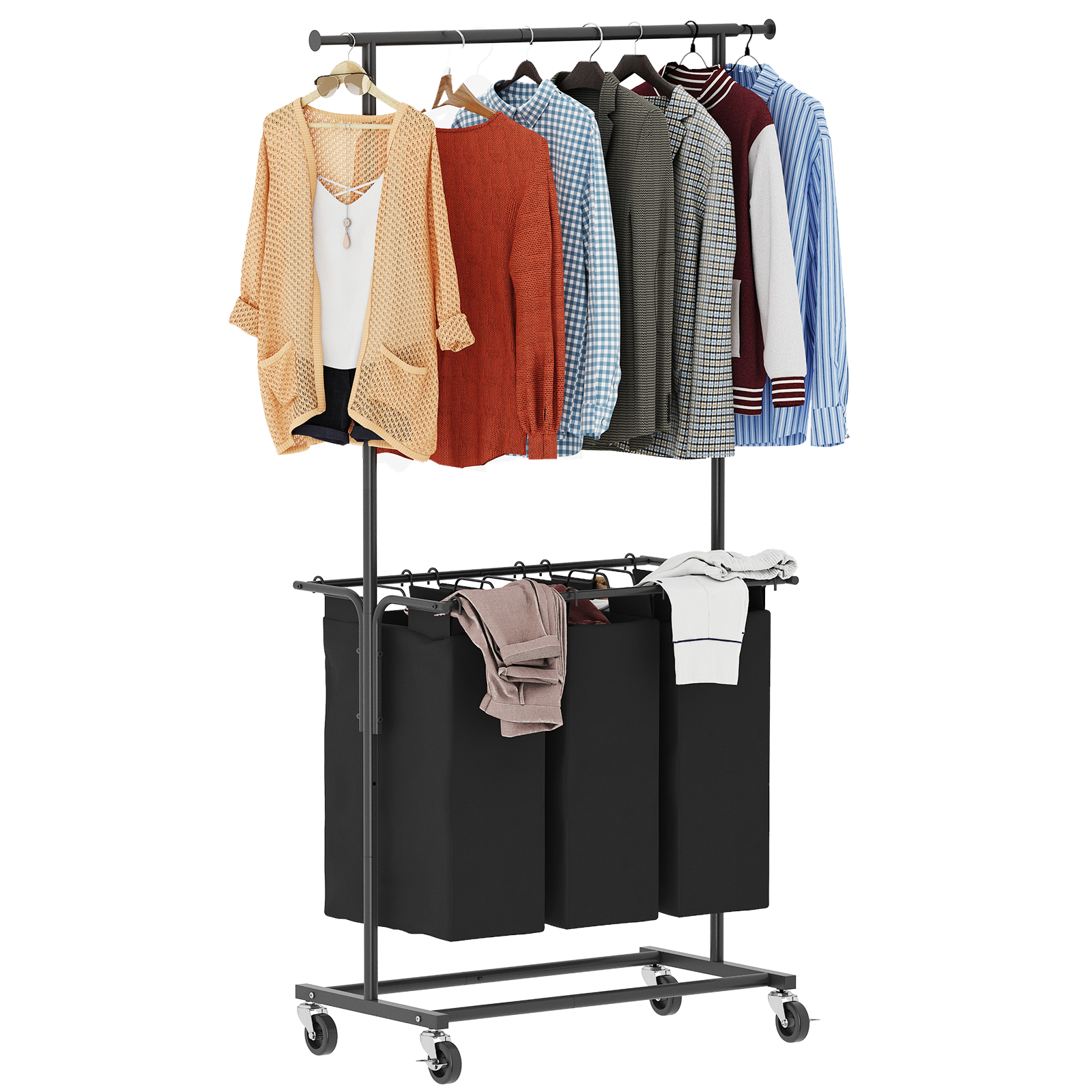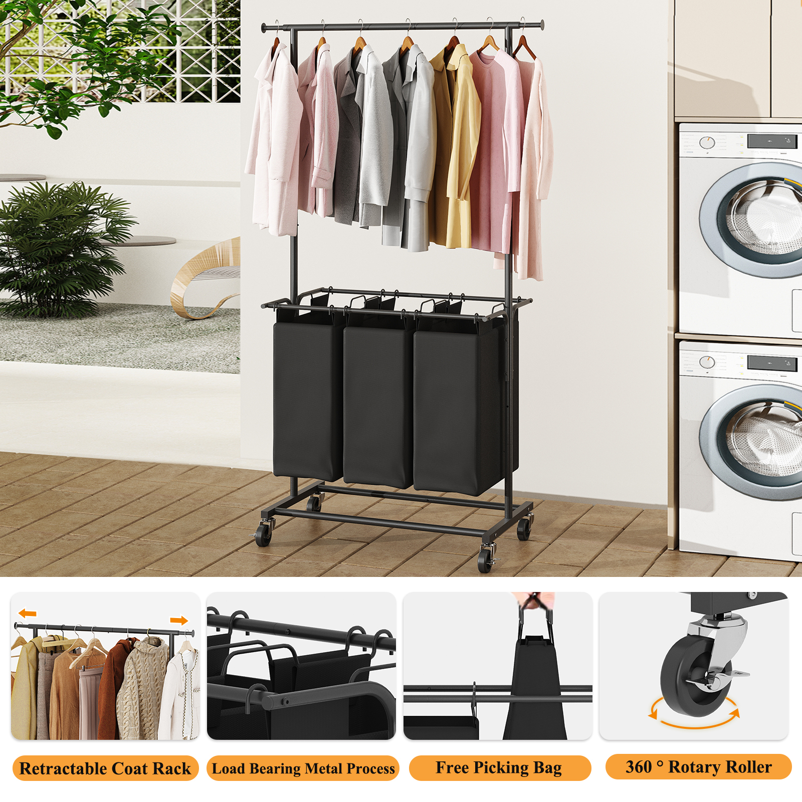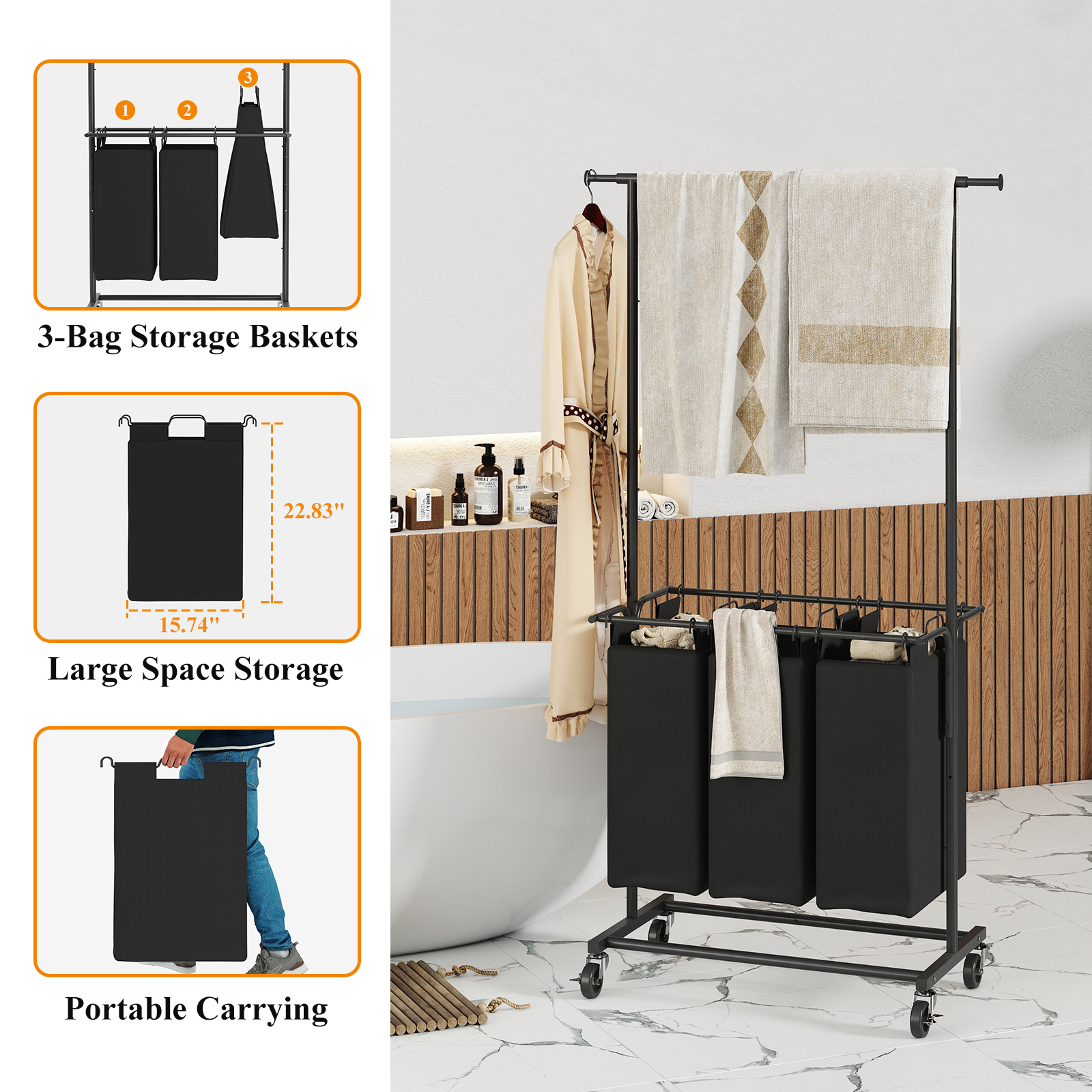 Wisdom Star 3 Bag Laundry Sorter Cart with Coat Rack, Laundry Hamper Sorter with Rolling Wheels and Removable Bags for Clothes Storage,Laundry Organizer Basket Laundry Clothes Hamper, Black