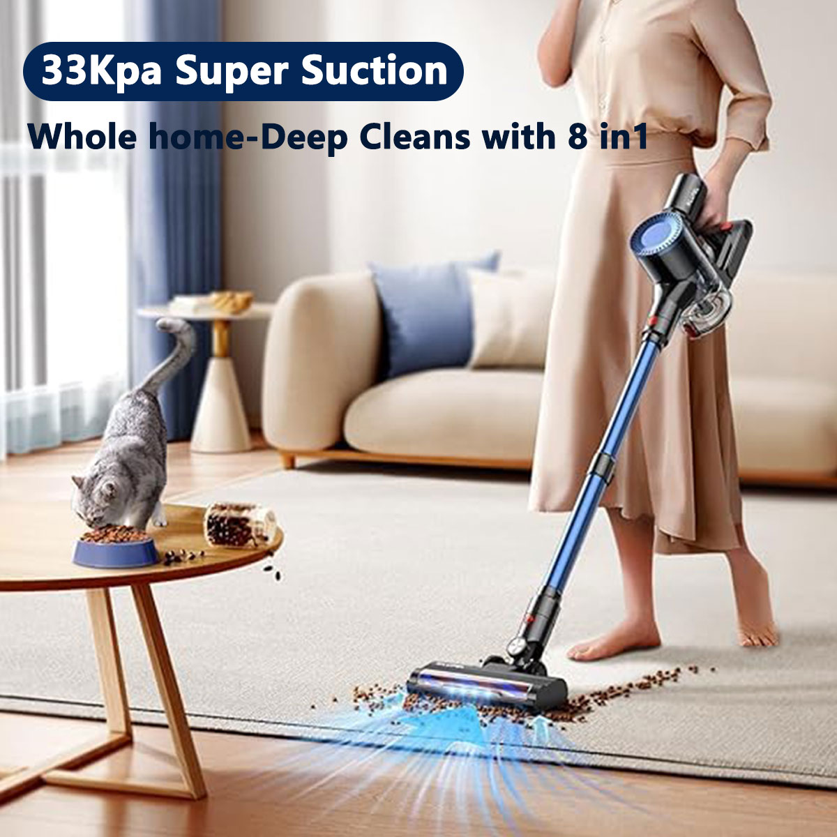 - [IQ LED Display] Get the information of cordless vacuum cleaner performance in real time, includes real-time readouts on runtime, floor brush operating status, power mode.[2 Powerful Suction Modes] The cordless vacuum cleaner equipped with a 400W upgrade motor. In the maximum mode, it provides a powerful 33 Kpa suction power to capture pet hair, cat litter, dirt, and other messes debris, whether on the carpet or on the floor.[Better Cleaning Results] Configure the 7 -layer sealing filtering system, and the vacuum cleaner can capture 99.99 % of fine particles to 0.1um, and provide strong centrifugal force to effectively separate dirt, and finally output pure air.[Up to 45 Mins of Runtime] A detachable high-performance batteries can provide as long as 45 minutes of uninterrupted operation time (* Measured at the Hand Vacuum in Low Mode, Without Accessories.), Contains 6-CELL BATTERIES.