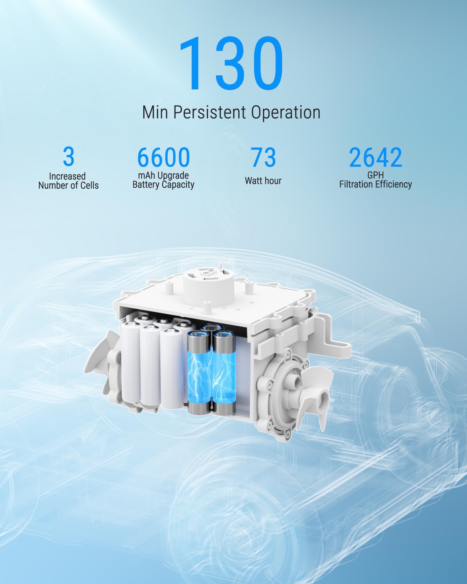 - Extended Operating Time: Experience long-lasting power with the upgraded large battery. Wybot Cordless Pool Vacuum equipped with 6600mAh large capacity battery, ensuring a runtime up to 130 Mins. You can effectively to clean the whole pools without having to stop and recharge the battery frequently. It only takes 3 hours to fully charge.