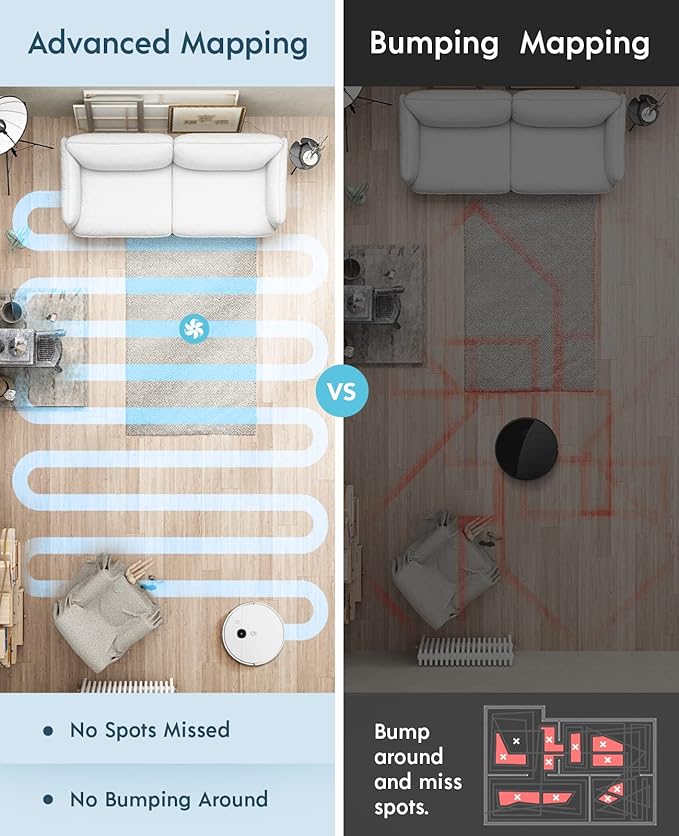 - [Extended Runtime & Automatic Recharge] Designed for big cleaning tasks, the yeedi vac offers an extended 110-minute runtime. It seamlessly resumes cleaning from where it left off after recharging. The smart system recognizes your rooms and creates a customizable home map. Easily choose specific rooms or mark areas to clean or avoid with a simple tap on the map.