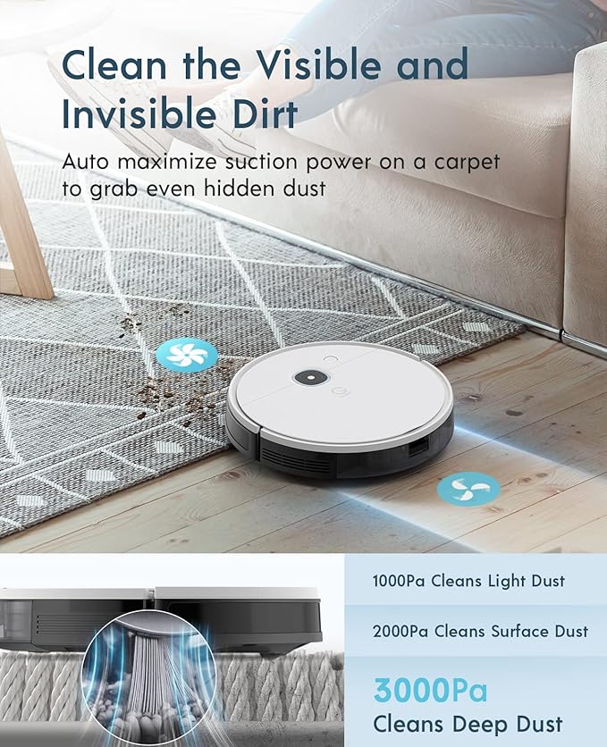 - [Impressive 3000Pa Powerful Suction] Featuring a side brush and main rolling brush, the yeedi robot vacuum boasts an impressive 3000Pa suction power that effortlessly captures embedded dust on carpets and hard floors. It\’s an ideal choice for pet-friendly apartments, ensuring a clean and fresh living environment.