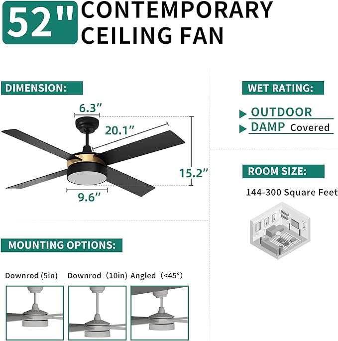 - EASY ASSEMBLY: Comes with 5in and 10in hanging rod so that this fan light can be downrod or angled mounted(max 15°). Also, pre-install wire clips, instruction, balance kit and complete accessories are all included for easy wire connection and installation, no wobbling worries!