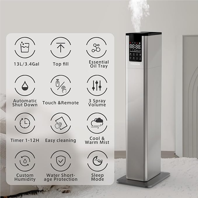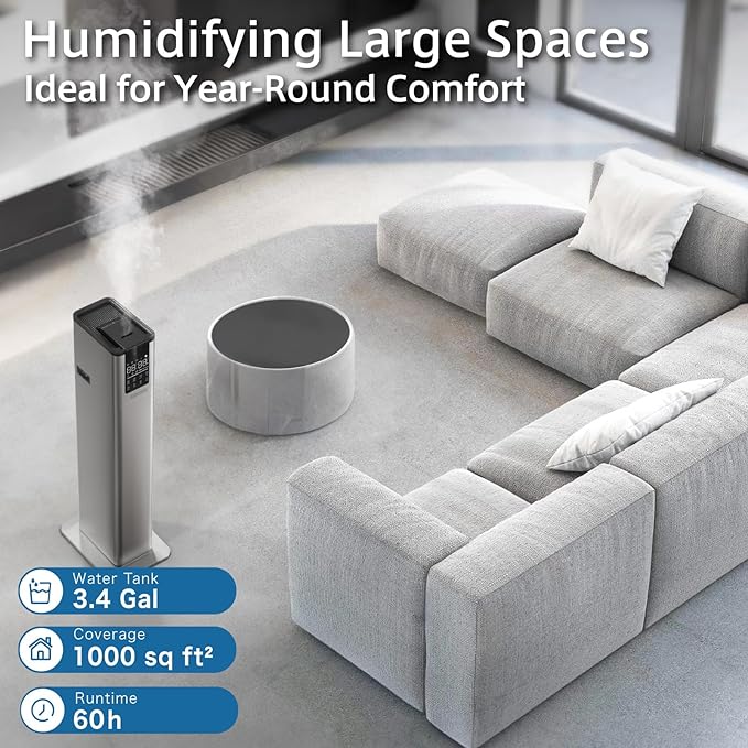 - ๐๐ผ๐ป๐ด๐ฒ๐๐ถ๐๐ & ๐๐ป๐ต๐ฎ๐ป๐ฐ๐ฒ๐ฑ ๐๐ผ๐๐ฒ๐ฟ๐ฎ๐ด๐ฒ ๐๐๐บ๐ถ๐ฑ๐ถ๐๐: Transform your spacious environment, up to 1000 sq.ft., including bedrooms, living rooms, offices, and greenhouses, with our 3.4Gal/13L floor humidifier. Combat dry air concerns and bask in the benefits. Experience up to 48 hours of continuous mist for a calming ambiance adored by your family, baby, or pets. Discover ultimate ease with dual control options: an intuitive LED touch panel and a convenient remote control.